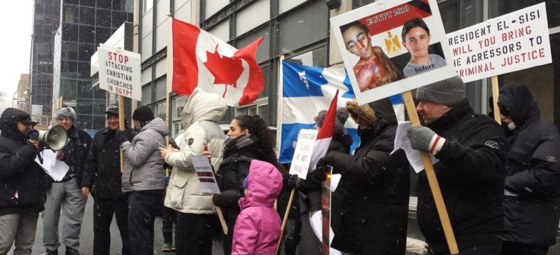 كانت الهيئة القبطية الكندية والمنظمة الكندية المصرية لحقوق الانسان ومنظمة التضامن القبطي ومنتدى الشرق الاوسط للحريات قد دعت اقباط كندا لوقفة احتجاجية امام القنصلية المصرية بمدينة مونتريال للتنديد بأعمال العنف ضد الاقباط وخطف الفتيات القبطيات والقتل العمد الذي يتعرض له الاقباط في مصر.